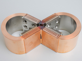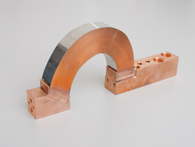 Aufgezeigte Beispielbilder zeigen Kupferbänder mit massiven Anschlussstücken die mittels Elektronenstrahlschweissen im kompletten Querschnitt mit einem Folienpaket aus Kupfer und Chrom-Nickel-Stahl verschweisst wurden.