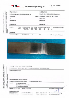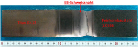 SwissBeam hat nun eine Möglichkeit erarbeitet, ohne Dritt- Materialien und intermetallischer Phasen eine Verbindung zwischen Stahl und Titan erfolgreich herzustellen. Bei einem ersten Festigkeitstest der Verbindung Titan Gr.12 mit einem Feinkornbaustahl 1.0566 (450 - 590 N/mm²) wurden Zugfestigkeitswerte von 579 N/mm2 erzielt, was den Grundwerten des Feinkornbaustahls entspricht. Erwähnenswert ist hierbei, dass die Bruchzone ausserhalb der Schweisszone liegt. Eine Reproduzierbarkeit und damit auch die Prozesssicherheit der Verbindung sind gegeben.