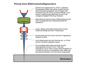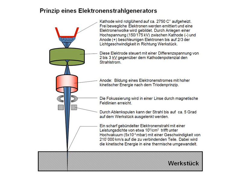 Besonders die hohe Geschwindigkeit von 210'000 km/s und die brillante Trägheit des Elektronenstrahls kann nur in einem Vakuum geformt werden. Der geradlinige Strahl kann durch ein Magnetfeld mit verschieden geformten Konturen schwerelos abgelenkt werden. EBW ist frei von möglichen Gasverunreinigungen, da der eigentliche Schmelzprozess unter einem Vakuum von 5 x 10-4 mbar erfolgt, entstehen hervorragende metallurgische Ergebnisse. Das Vakuum hilft neben der hohen Leistungsdichte des Elektronenstrahls auch bei der Bildung des Tiefschweisseffekts, der ausserordentlich grosse Schweisstiefen mit hohen Schweissgeschwindigkeiten ermöglicht.